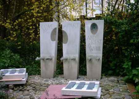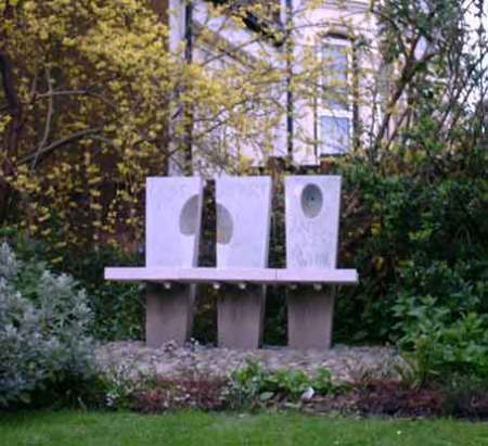 The first picture shows the finished piece in the garden setting of a small church in Essex, England, the next the bench being assembled. Stainless steel rods support the seat.