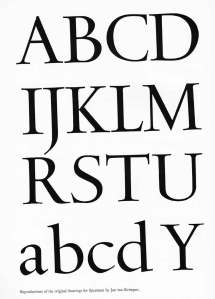 These are reproductions of the original drawings for the Spectrum typeface designed by Jan van Krimpen, a distinguished typographer based in the Netherlands. It was designed for use in a Bible, being named after the company that commissioned the face – the Spectrum Publishing Company of Utrecht and Brussels.