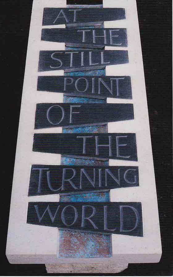 The next is a simple stone bench. It was made from limestone with slate insets. The text is from TS Eliot. The channel was filed with copper leaf and patinated, something which became a signature item for pieces I make.