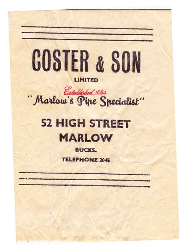 Next a little bag from a tobacconist, probably printed by a small jobbing printer. (I used to smoke in those days, a pipe, and this shop held a great variety of loose tobaccos: this bag, though, was probably for purchase of a pipe as it is long and slender.) Use of Gill Sans, which all jobbing printers would have had in stock, possibly hand-set too.