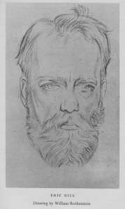 The first is a sketch by William Rothenstein (page 83). It isn’t dated but by the look Gill must have been in his 30s. He isn’t wearing glasses and he looks slightly to the right of the spectator, with a determined expression.