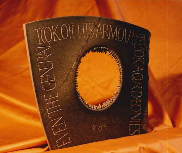 Another example of my sculptural lettering, this on green slate, about 30 by 30 cm. The text reads: Even the general took off his armour to look at the paeonies.