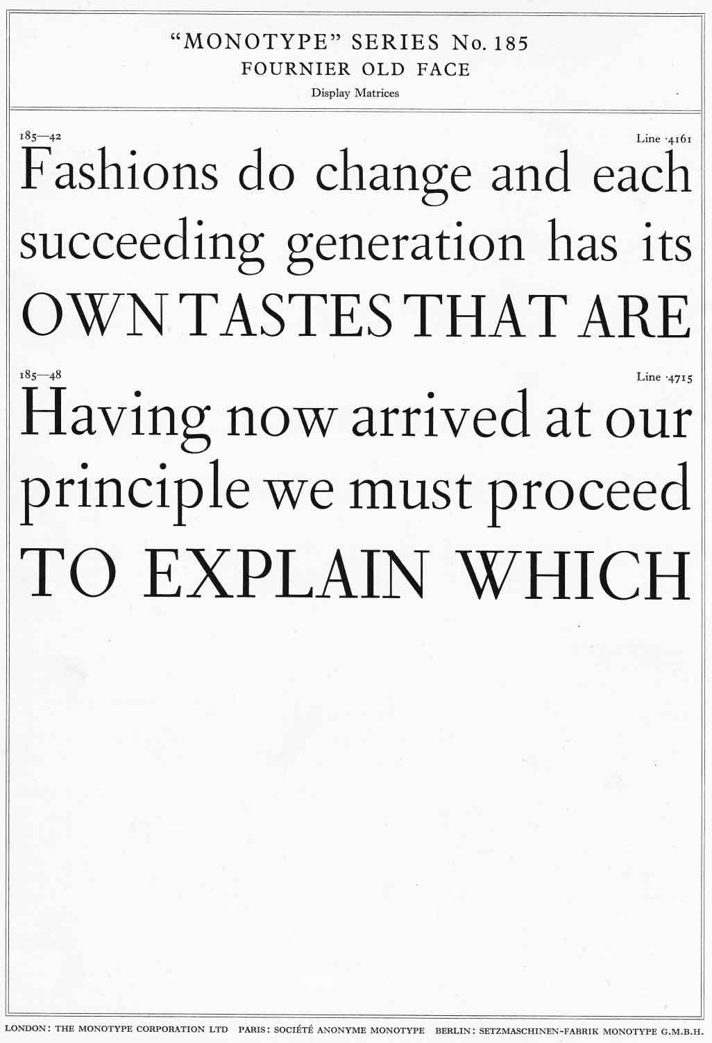 Here’s the proof: the pages taken from a Monotype specimen catalogue. Fournier of course follows the tradition of squared serifs, whereas Perpetua (by Gill) followed the Roman Trajan tradition with serifs that mimicked the action of the hand held chisel.