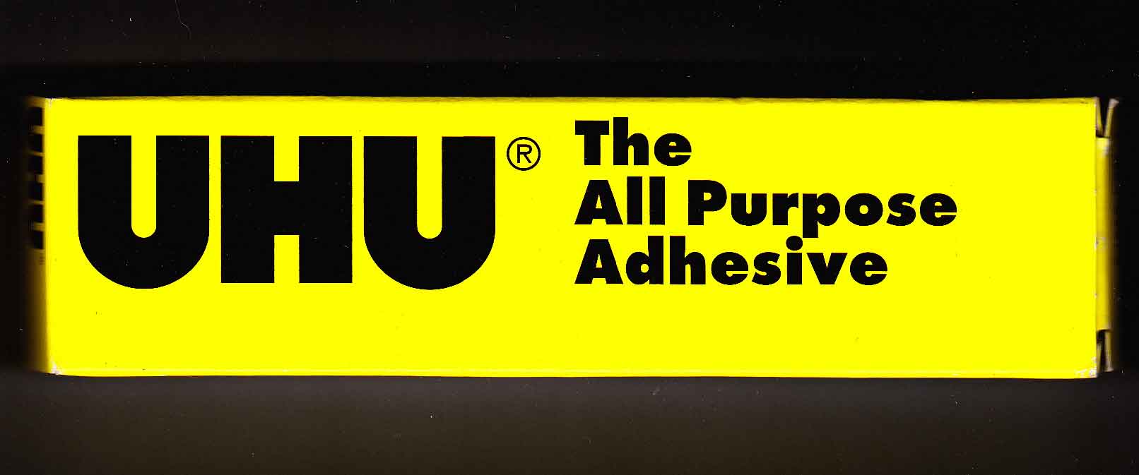 UHU Glue is one of the most distinctive brands around, simple use of black on yellow, strong typeface that underscores the strength of the product.