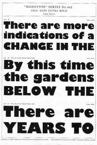 Harling writes: “Back to novelties, we find that Eric Gill has again adventured into the display world with two new types, one of which, Jubilee, is almost ecclesiastical in its dignity, stability and general decorum, and the other, Kayo, so fantastic as to take us immediately back to the dark ages of so much of the nineteenth-century display typography. Kayo is a dismal type. ..The type was originally named Double Elefans, which had a very pleasant touch of the lampoon about it. The new name, Kayo, is too horribly truthful. ..Typographical historians of 2000AD (which isn’t, after all, so very far away) will find this odd outburst in Mr Gill’s career, and will spend much time in attempting to track down this sad psychological state of his during 1936.”