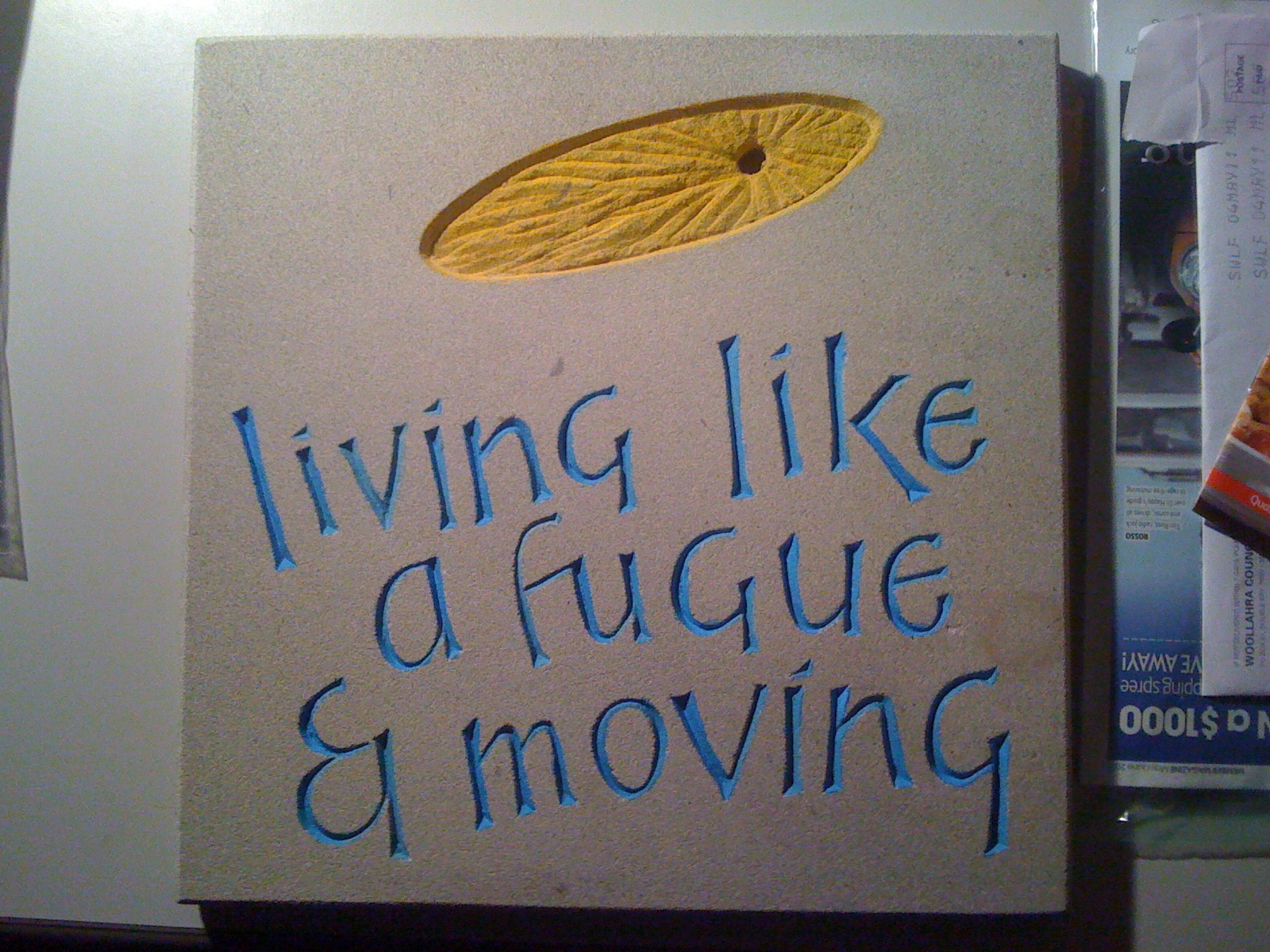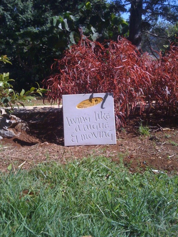 A couple of weeks back I posted this about a piece I had carved. It has gone through a few new phases, but first the piece in an outside context, followed by a further amendment – colouring in the carved letters. This helps the piece stand out when sunlight is not playing over the face. I use acrylic for outdoors; watercolour is adequate if the piece is to remain indoors. Since this item is sandstone you have to be careful when painting as the stone is very absorbent. It is possible to rub over the face with another piece of sandstone to tidy up any blemishes.