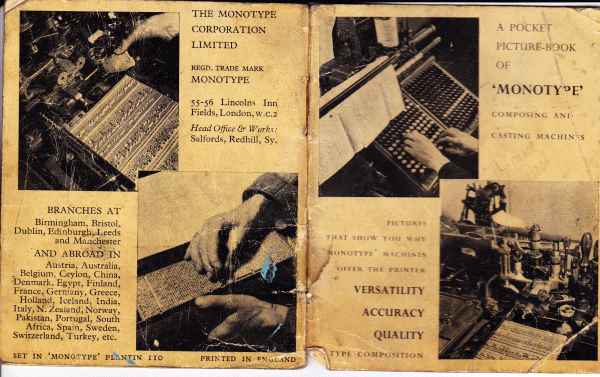 Those who have only known computer-setting may be at a loss to fathom how this machine, illustrated above, worked using nothing more than compressed air, the molten lead when injected into the mould cooled by water. It is a marvel of engineering, of exact engineering, for the tolerances are so fine that should anything be out of alignment the thing won’t work. And yet it is a machine whose moving parts can be understood by any mechanic – nothing is hidden – and it can be disassembled fairly easily. That’s why Monotype became so successful throughout the world, with machines, possibly, still in use somewhere out there – from China to Turkey, from New Zealand to Sri Lanka. (PS – if anyone knows of one for sale please do let me know! Also I have a reasonable library of Monotype manuals and instruction manuals – if anyone needs to know something please let me know.)