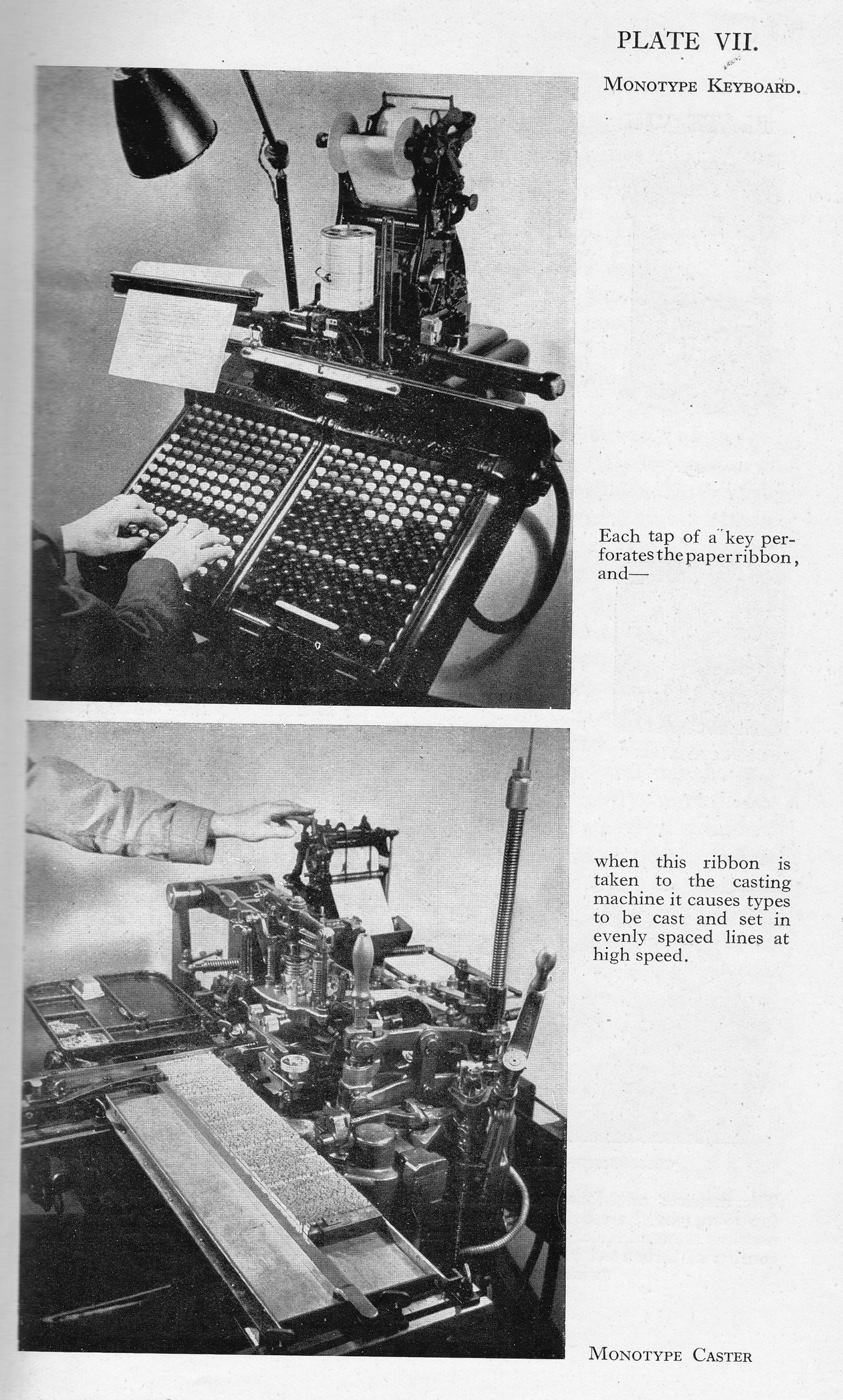 Anyhow, John Carr discusses where printing has come to at the end of the war, and illustrates the text with numerous goodies (some others I will share in the future). But these images most beautifully show the Monotype.