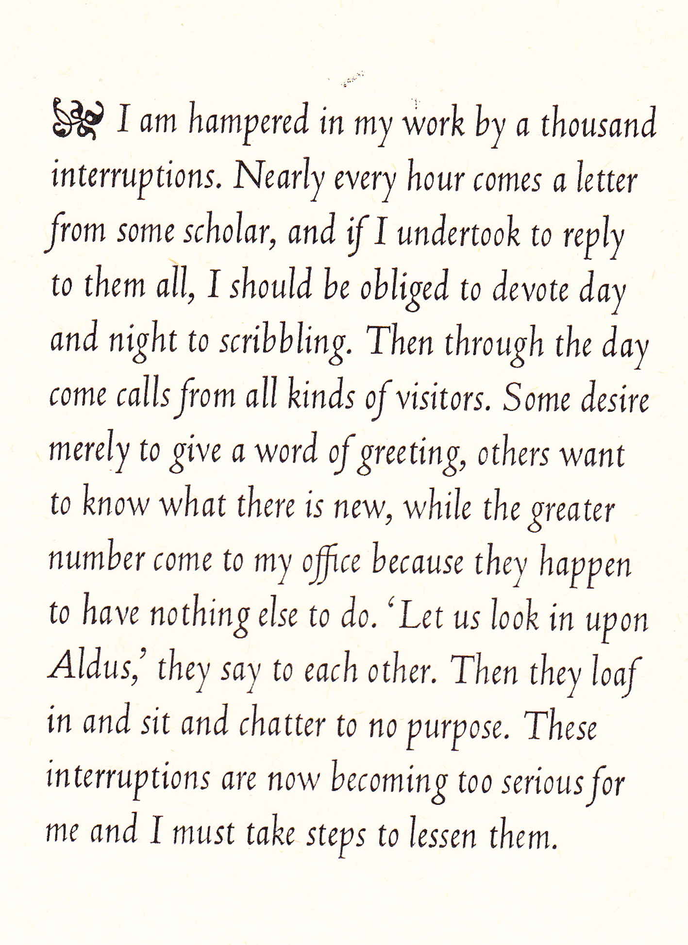 Heheh. I love this. I am thinking of recreating this quote using modern idiom as it is a good example of the interuptions I get. It will be in some sort of italic, though not Benbow.
