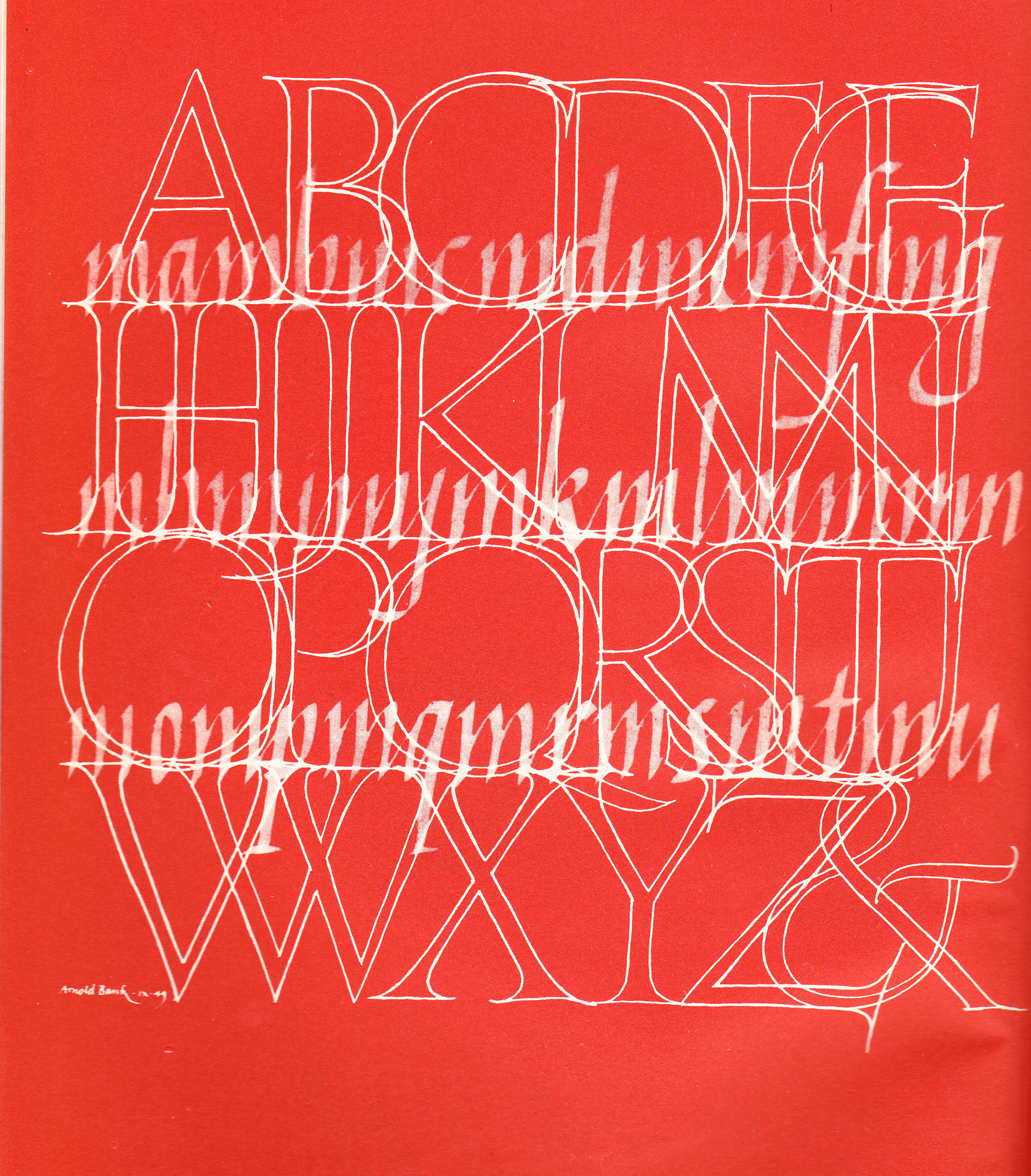 Arnold Bank, Carnegie Mellon University professor in the Design Department from 1960-1984, was a calligrapher of international stature. His career spanned the fields of education, publishing, advertising, printing, and architectural lettering. Bank, as a Senior Fulbright Fellow, taught at the Royal College of Art in London from 1954-1957, and was art director in the Time magazine promotion department from 1941-1947.