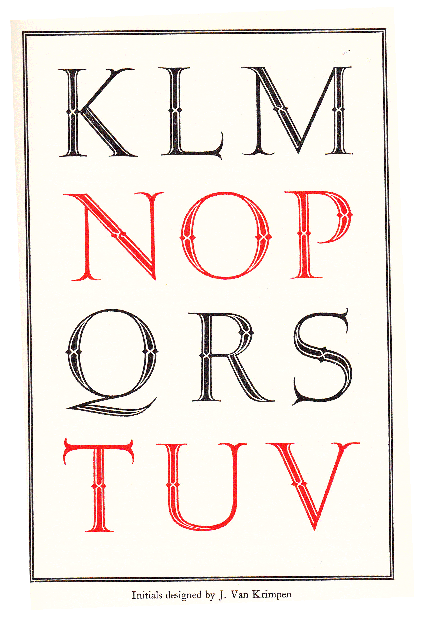 These elegant initials were reproduced in Songs and Words, A History of the Curwen Press, by Herbert Simon. The initials were printed in Curwen Press Miscellany of 1931, designed and edited by Oliver Simon. Herbert Simon writes of them: “They have the authority of a master…” For more on Krimpen in this blog please click here.