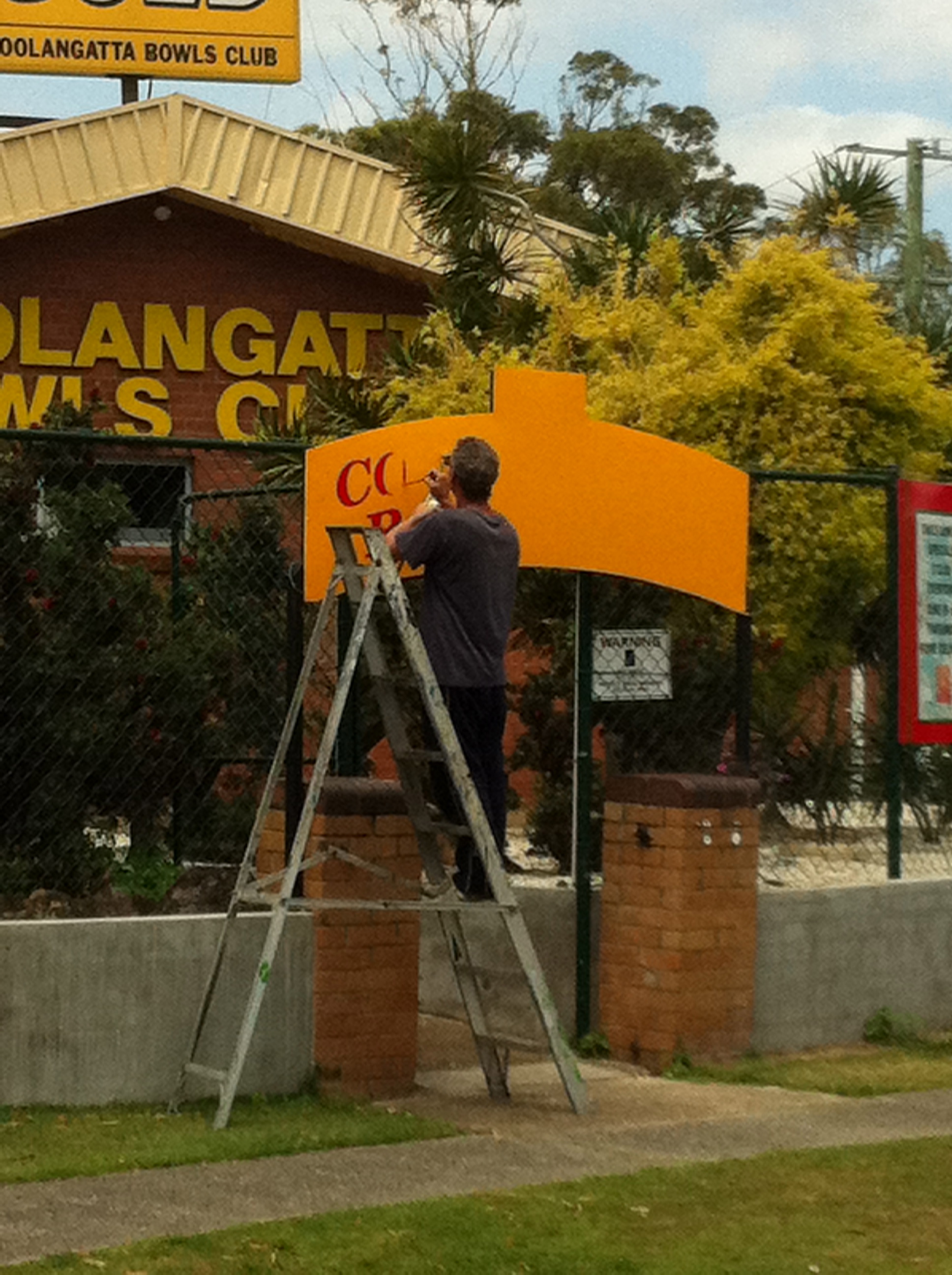I spotted Rick today doing what he does – signwriting. He was up a ladder and I took this photo of him at work before going over to have a chat. “There’s not many of us left” he told me. “Usually I work in vinyl. Don’t often get the paint pots out. People don’t want stuff that lasts.” He had trained as a signwriter he told me and gave me his card – “Rick Talarico – signwriter – all aspects of signage”. Good on you Rick. I will return and post his completed sign soon. (He uses ordinary enamel paint by the way.)