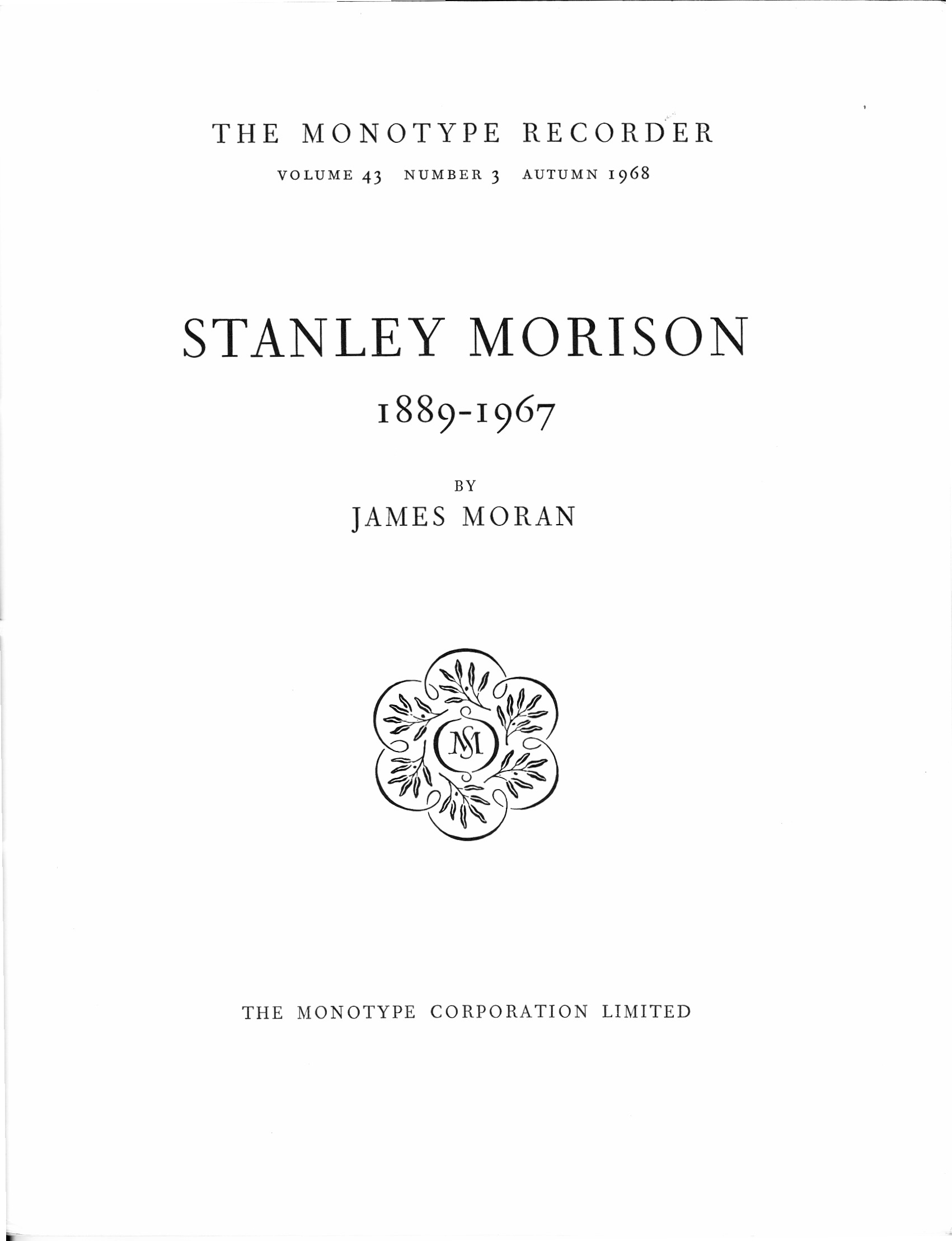 Stanley Morison is one of the giants of 20th century English typography, a man whose influence is felt everywhere, no less than at the Monotype Corporation where he was typographical adviser for many years. His death in 1967 prompted that company to issue a special edition of its ‘house magazine’, the Monotype Recorder, for the Autumn of 1968 from which these illustrations are taken.