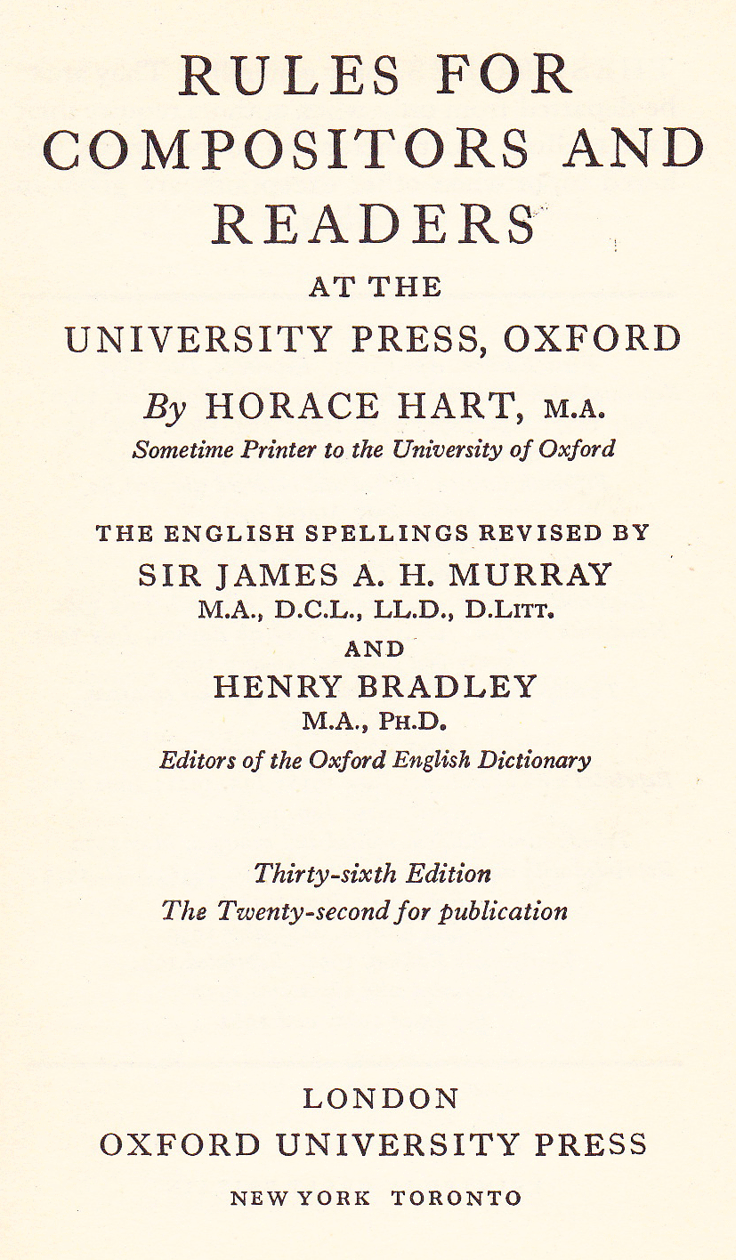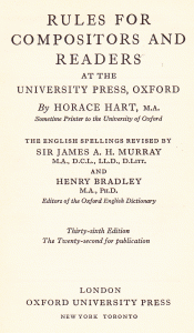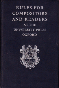 was issued by the Oxford University Press from 1893 to eternity (the latest edition I have was published in 2005 and called New Hart’s Rules. This shown here was published in 1962 in the famous dark blue buckram.). It was intended for compositors and readers at the Clarendon Press.