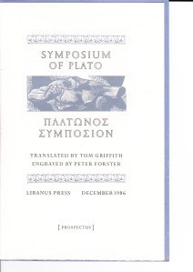 Among them the Libanus Press of Michael Mitchell at his workshop in Marlborough, Wiltshire. He kindly sent me a bundle of printed leaflets and prospectuses, all immaculate and beautiful, among them this announcing the publication of Plato’s Symposium with engravings by Peter Forster.