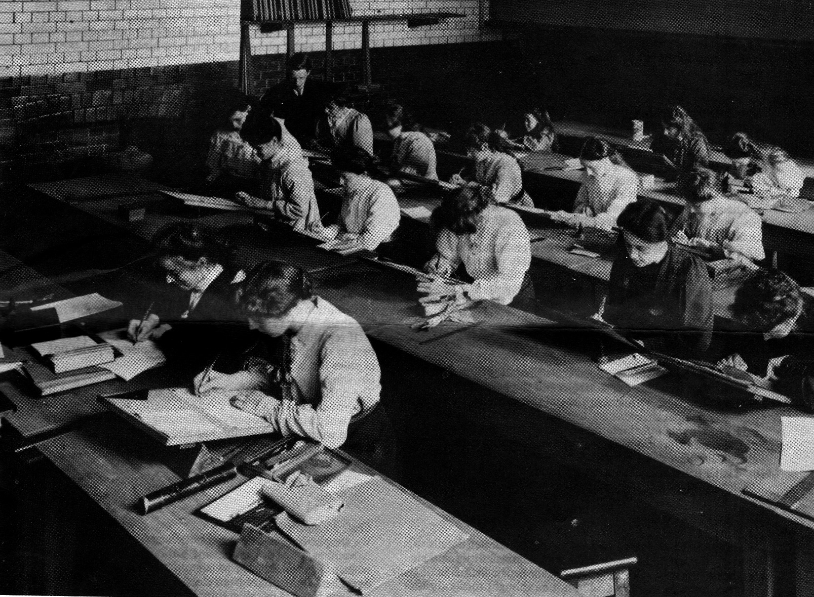 taken in 1907 at the Camberwell School of Arts and Crafts. It’s a fascinating picture in its own right and, as the caption notes, all but one of the twenty students are women. The caption goes on: “A clock in the photograph [not shown] reads 2.57pm and according to the school prospectus for 1907 Percy Smith taught the afternoon calligraphy class. He may be seen at the back talking to a student.”