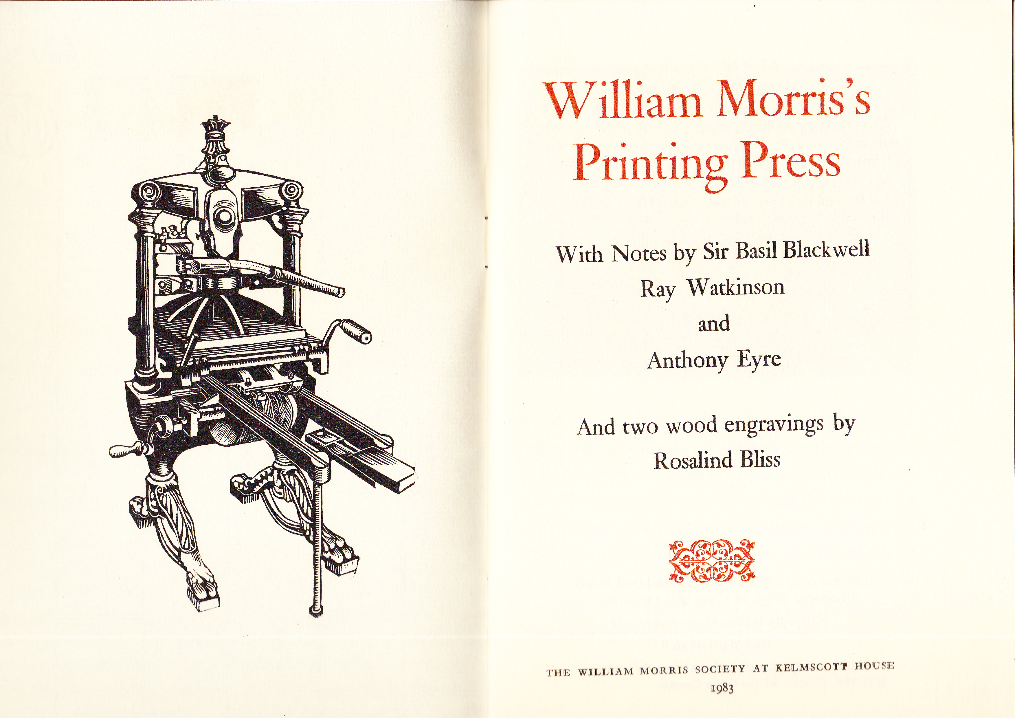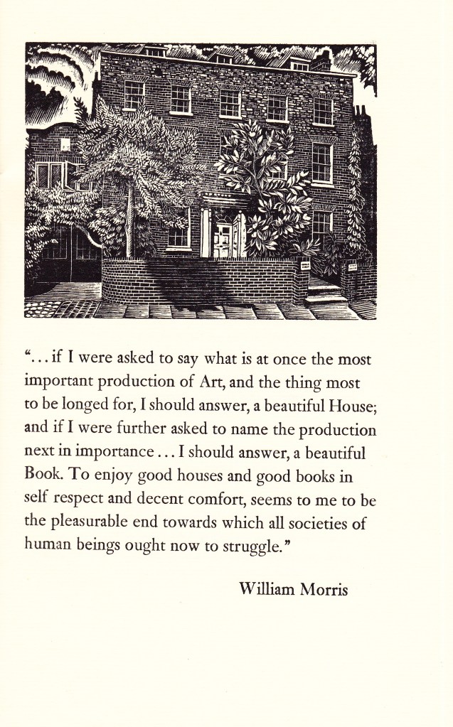 The source of this article is a booklet called William Morris’s Printing Press, published by the William Morris Society at Kelmscott House in 1983. A limited edition, my copy is 142 of 300 (with a number printed on handmade paper and signed). The illustrations are by Rosalind Bliss.