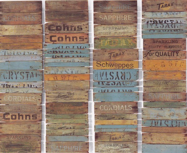 The first piece shown here is titled Southerly buster (1995, 117cm x 115cm); the second is a detail from Far View of 1990 (three panels, total dimensions 89cm x 221cm) and is made of sawn soft drink crates.