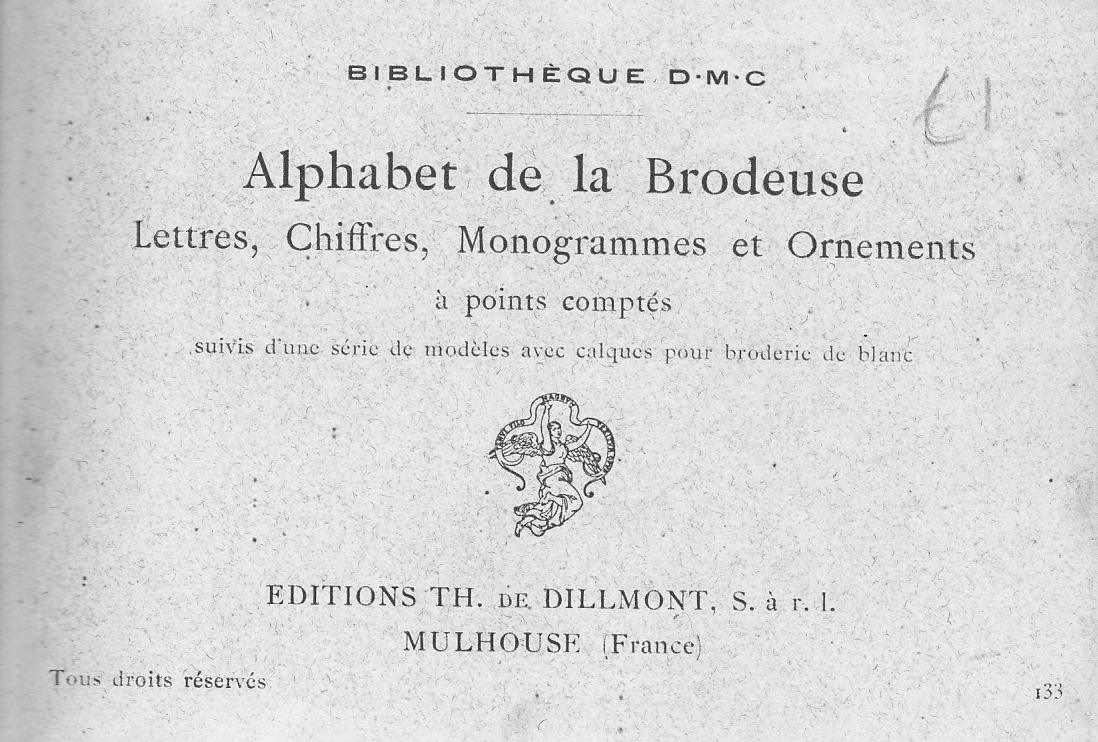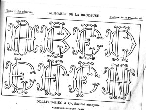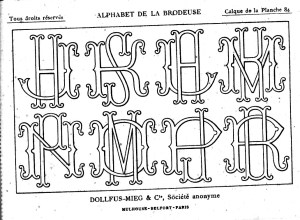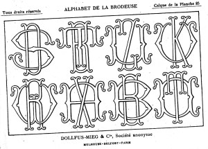 The illustrations shown here are taken from a small volume (14cm x 10cm) entitled Alphabet de la Brodeuse, lettres, chaffers, mono grammes et ornaments a points competes which was published by Editions Th. de. Dillmont of Mulhouse (France), not dated. In essence, it is an example of alphabets that can be used in needlework.