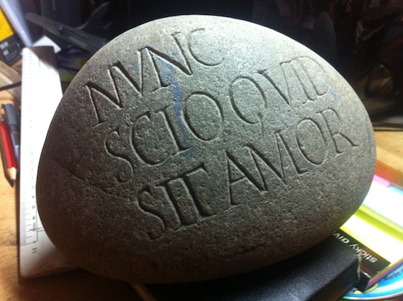 It seems stone carving brings out the Latin in people. I declare that I was guilty of this, as demonstrated by this example (17cm x 10cm). Why? Something about the Roman heritage of carving? Something about the permanence of the object that befits a dead language? Any other suggestions most welcome. (The inscription reads: Now I know what loves means. Would that have been better expressed in English? I think not. But then I am a romantic.)