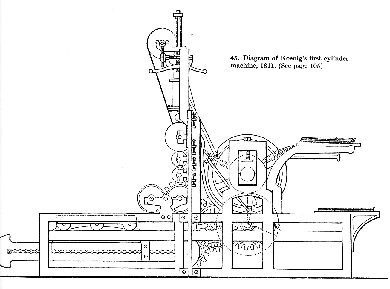 Moran notes that Friedrich Koenig (born 1774) came up with the idea of a mechanised press in 1803 when he was in Saxony. Nothing came of the idea (Europe was rather taken up with wars at the time), so he came to London where he contacted some printers in Fleet Street. It was here he joined forces with Andreas Bauer, an engineer. By 1811 a machine had been built using the conventional platen process. While this worked the principle, writes Moran, was a ‘dead-end’, pushing Koenig to the cylinder, a patent being sought in October of the same year. For those into minutiae, ‘sheets G and X of Clarkson’s Life of WIlliam Penn, volume 1, were the first ever to be printed by a cylinder flatbed machine’ (p.106). Interestingly, the rollers were leather-covered since composition rollers were still being developed around this time. While the press could produce 800 impressions an hour one newspaper proprietor, James Perry of the Morning Chronicle, was not impressed leaving the field open to the entrepreneurial John Walter.