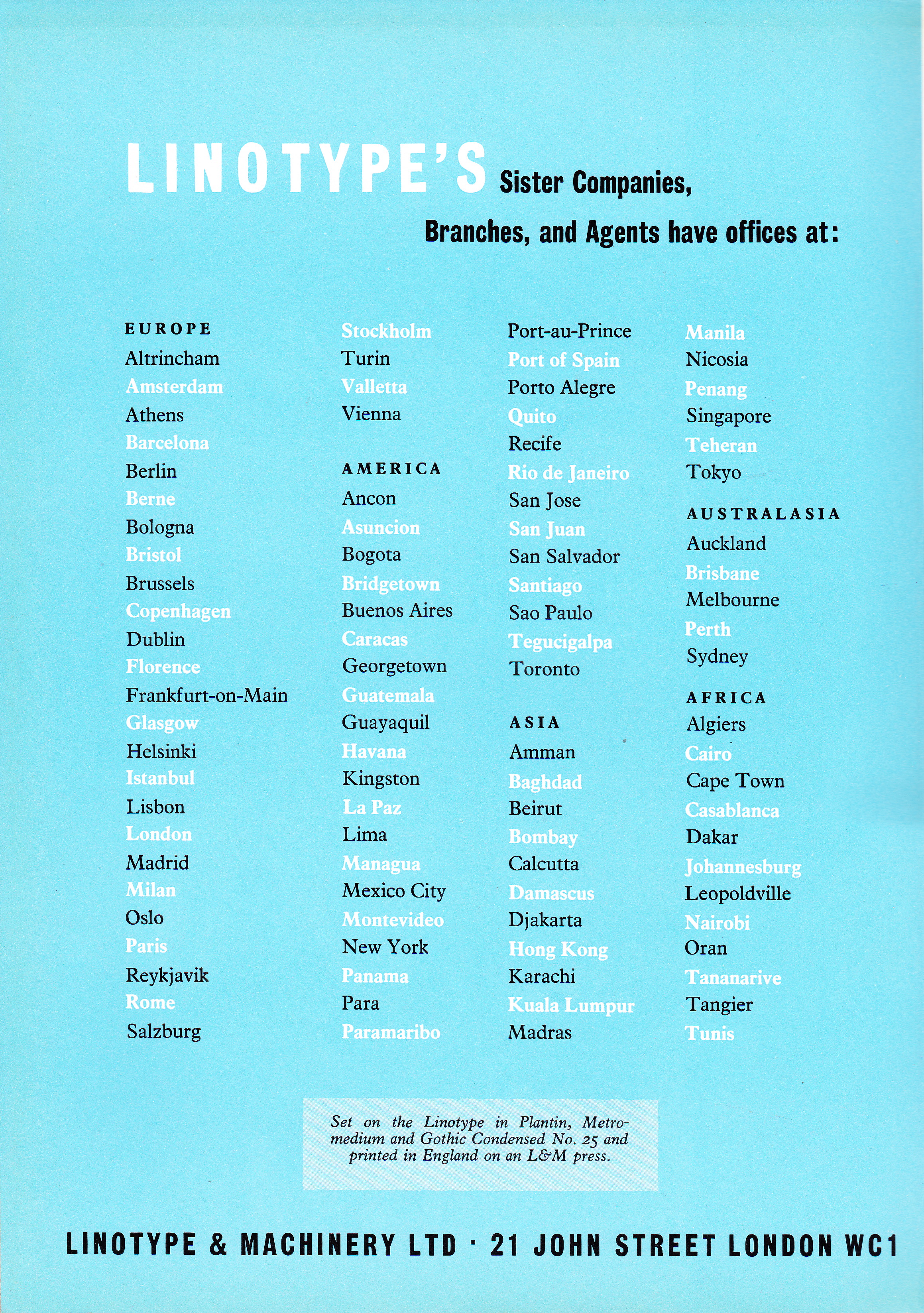 They were like Apple and Microsoft, two giants of the printing industry slugging it out. I refer, of course, to Monotype and Linotype. How the mighty are fallen. These illustrations are from 1957 when Linotype really did rule the world – offices and manufacturing in all parts, some expected, some least expected. Take note both Apple and Microsoft – you may rule now but in half a century, who knows.