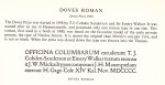 both shown here. Why did C-B do this? One theory is that when the partnership with Walker was dissolved (1909) it was agreed that C-B could continue using the Doves Roman during his life, after which it would pass to Walker. C-B decided to abort this agreement. He wrote: ‘To the bed of the River Thames, the River on whose banks I have printed all my printed books, I, the Doves Press, bequeath The Doves Press Fount of Type, – the punches, matrices and the type…And may the River, in its tides and flows, pass over them to and from the great sea for ever and ever, or until its tides and flow for ever cease…untouched of other use’. What a waste.
