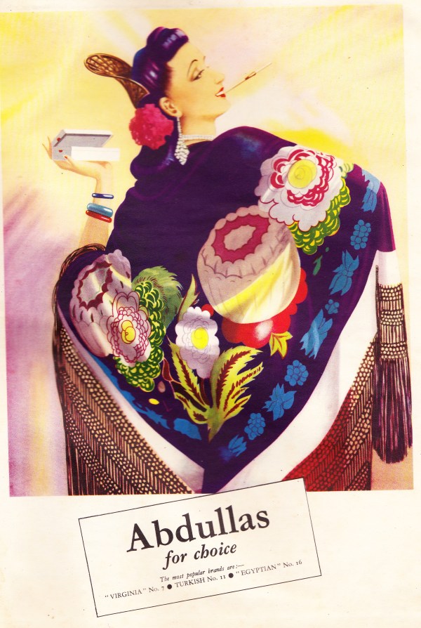 Such was the advertising art of the late 1940s (post-war) from which this advert is drawn. How an industry has been destroyed in a couple of generations. I place it in this blog for it is a piece of whimsy, and also forms part of our social history when beautiful women in beautiful gowns were called on by the men of advertising to promote the art of smoking.