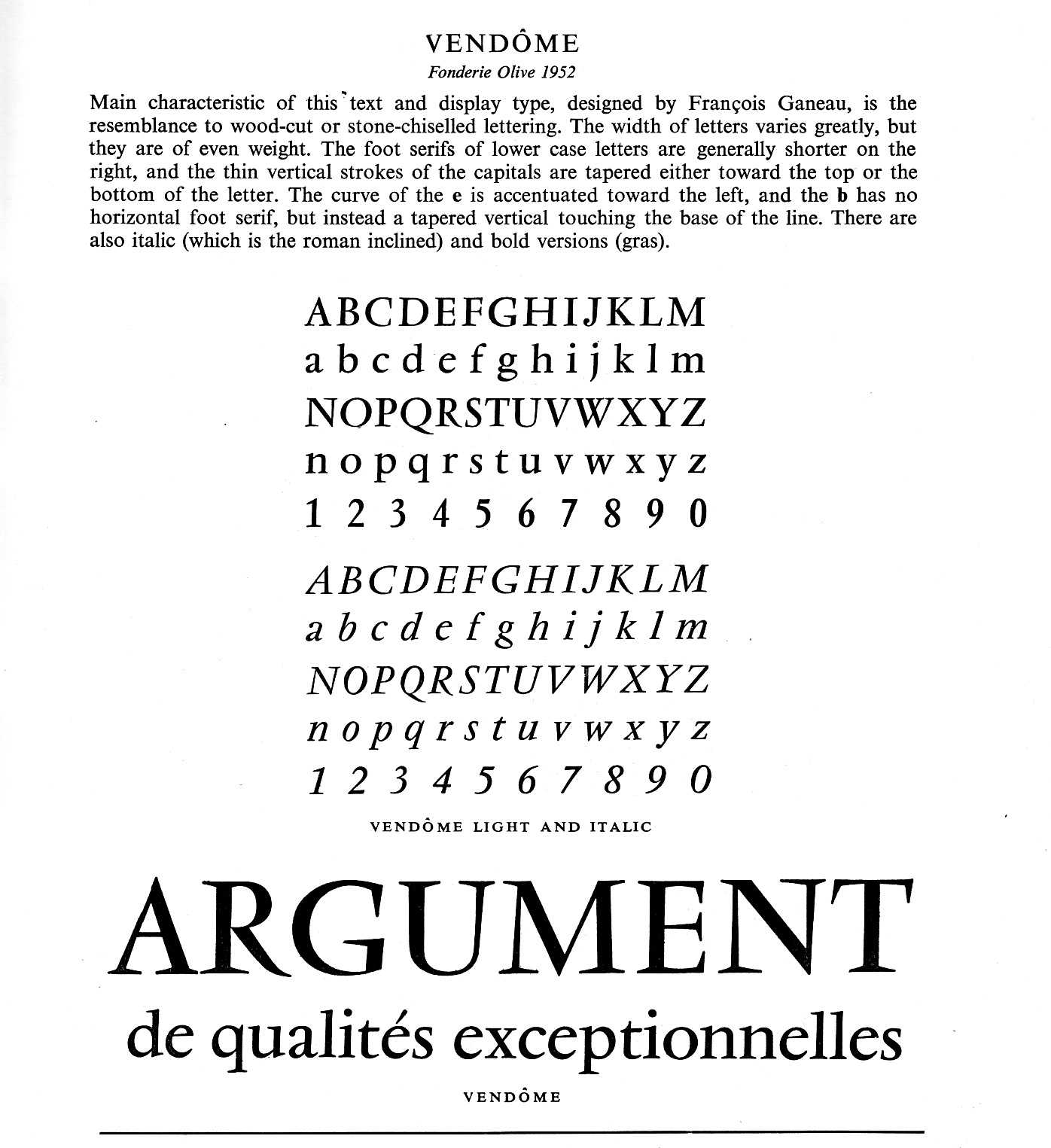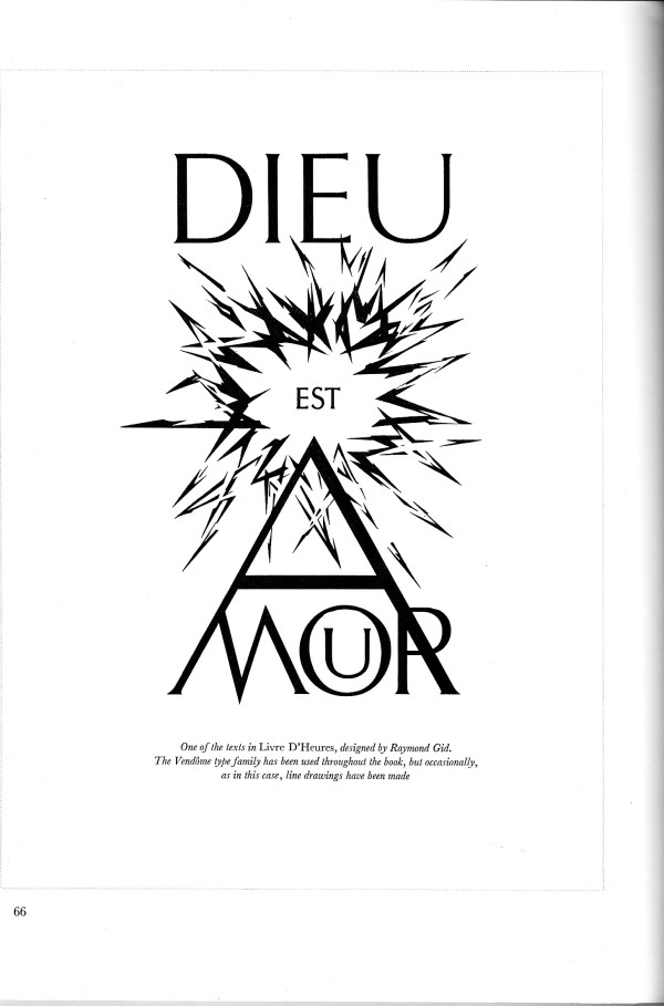 Sometimes an illustration hits you with such force that you just want to share it with others. Such is this, which I came across in Book Design and Production, vol 2, number 2, of 1959. The accompanying text relates that it comes from Livre D’Heures of 1959 and was designed by Raymond Gid using the Vendome type family. Of this type it is described as having a ‘resemblance to wood-cut or stone-chiselled lettering’. A same is shown below, though it does not seem to bear much resemblance to the text above – answers please.