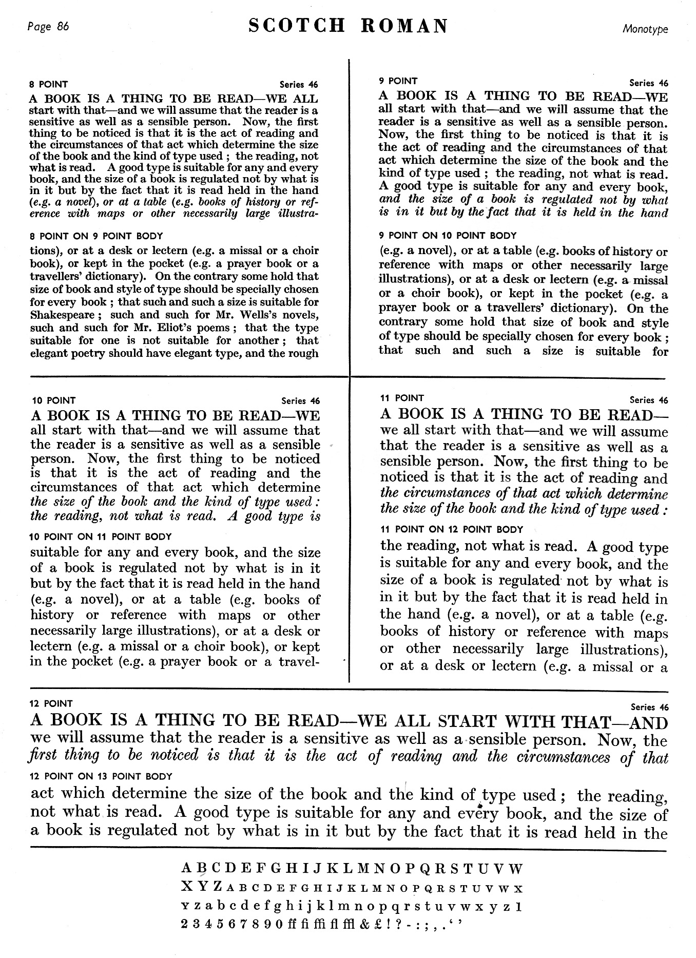 Scotch Roman, writes Alexander Lawson in the very readable Anatomy of a Typeface (1990), was the name given to a fount produced in Scotland by Alexander Wilson and cut in 1837; although, he adds, the present-day face has an earlier genesis, being cut c1809 by Richard Austin for an edition of the poet Dryden edited by the famous Scot writer, Sir Walter Scott. Linotype in the US used this as the basis for a recutting; while Monotype in England did the same in 1907. You can see that one does, indeed, need to have detective skills to fully trace the antecedents of a typeface.