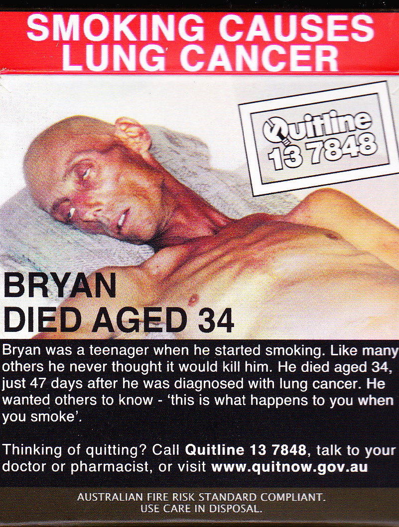 I am not a smoker. At least not now. I gave up when I was in my 30s. These images are from packets I have found on the kerbside, in the road, in waste-paper baskets. This is the Australian response to cigarette advertising. The so-called ‘plain paper packaging’ response. The campaign has been nominated for a graphics award. See here. But this is so more important than any award. Is the campaign working in Australia? Too early to tell. People will still smoke. That is their democratic right.