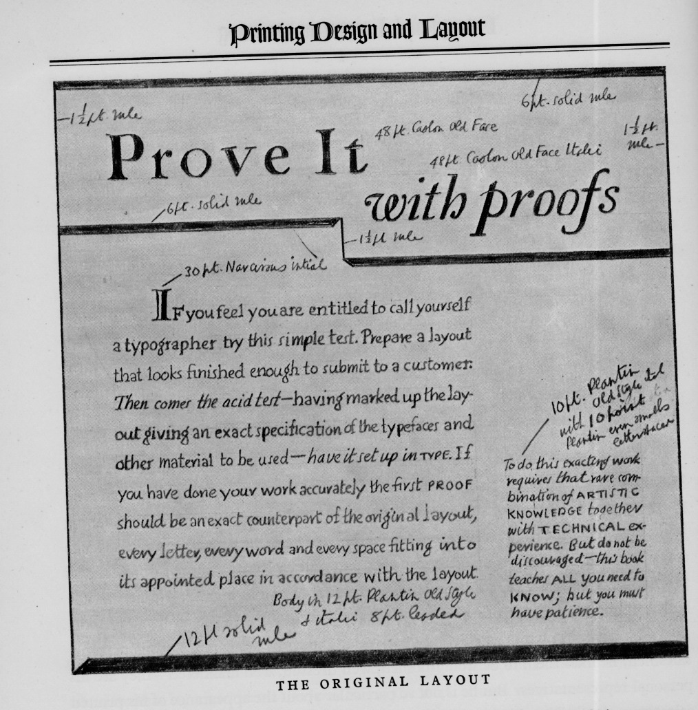 Let Steer put it his own way (from Printing Design and Layout: The manual for printers, typographers and all designers and users of printing and advertising): ‘A layout which is intended for submission to the customer must, in the first place, be carefully executed. While there is no need for meticulously finished lettering, it should convey a very near impression of the final result in type.’ And he gives this as an example.