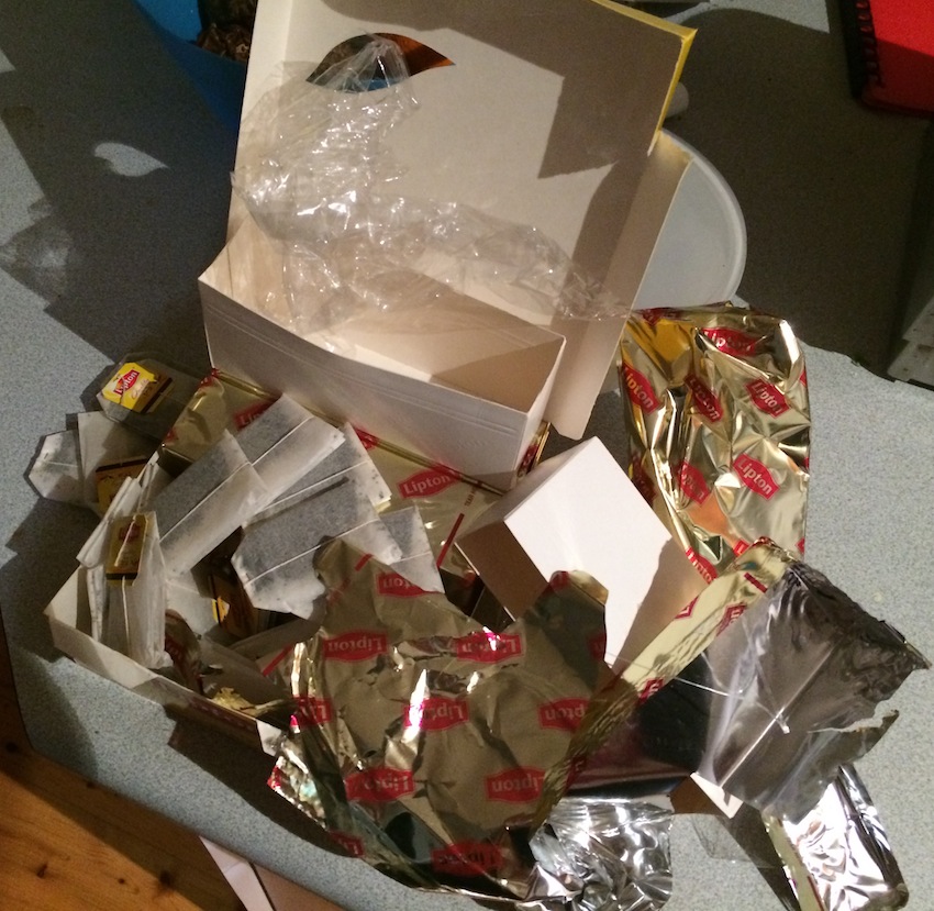 Wait a moment. As I dig into the packet I find myself confronted by a redundancy of packaging. As an archaeologist I am used to having to peel away layers in search of the evidence I seek. In this case I seek tea. I do not seek cellophane. I do not seek foil. I do not seek more thin card.
