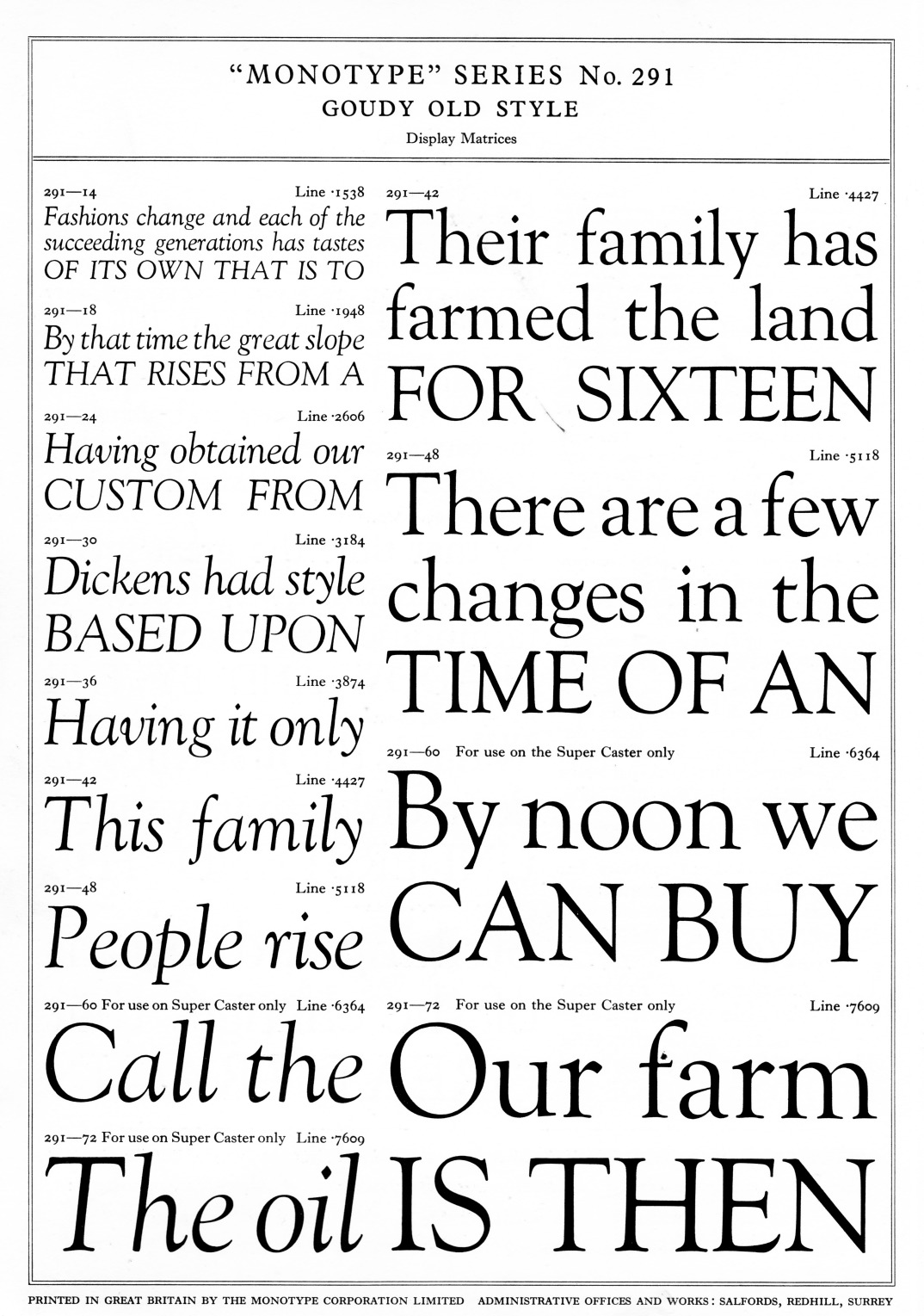 designed, it is noted, by ‘Frederic W Goudy, an American type designer, in 1915. It is a graceful, slightly eccentric typeface, and is prized by book designers for its elegance and readability’.
