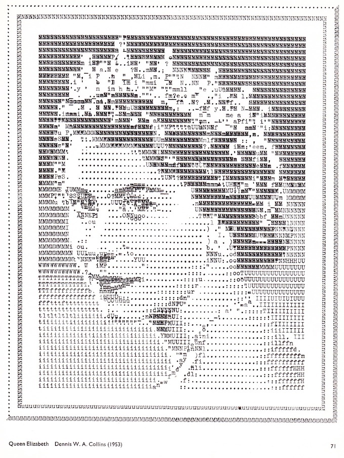 lengthening Christmas wish list). This piece was done on a typewriter and Collins notes: ‘The Queen’s portrait … [was] done on an old portable on which spaces could not be finely adjusted – this accounts for the horizontal white strips across the face…’ (For an earlier post on typewriter art see here.)